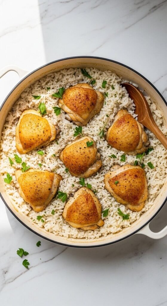 This is the ultimate comfort dish. Bone-in chicken thighs go straight into the pot with raw rice, broth, and a few pantry spices. The rice absorbs all the chicken fat and seasoning as it cooks. You get one pot, one meal, zero waste. Buy a family pack of thighs — they’re almost always the cheapest cut. Add a can of diced tomatoes if you want extra flavor. Done in under 45 minutes.