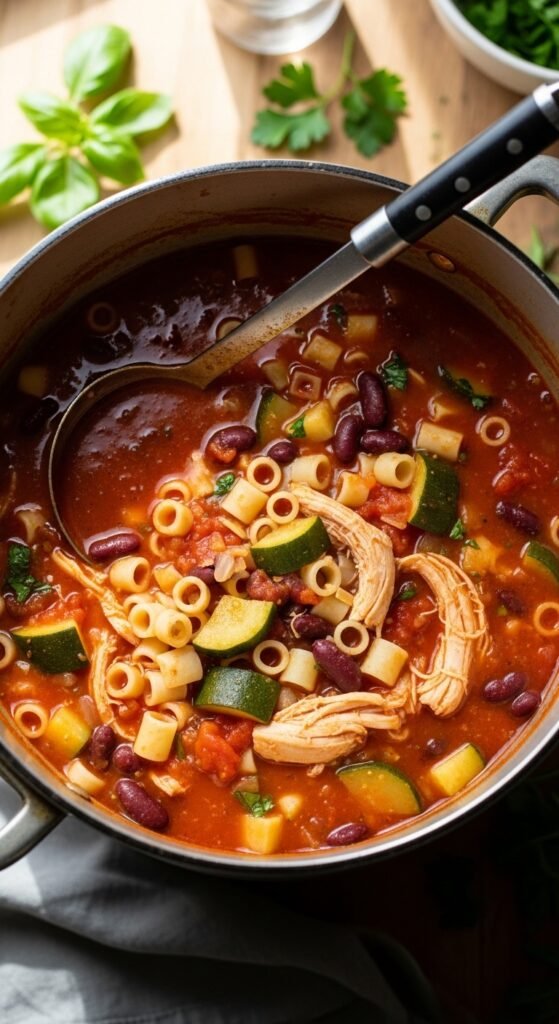 Add diced chicken to a pot with canned tomatoes, broth, and whatever vegetables are in your fridge. Zucchini, carrots, celery, canned beans — all work perfectly. Toss in a small pasta like ditalini or elbows in the last 10 minutes. This is a great use-what-you-have soup. A pot of minestrone stretches a small amount of chicken into 6 servings easily. Great for clearing out the vegetable drawer before it goes bad.