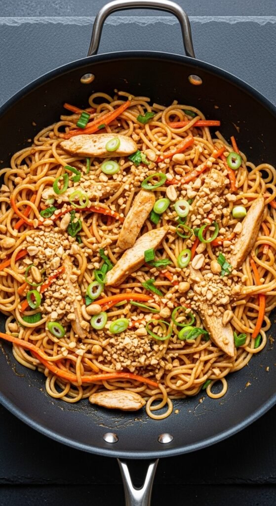 Make the sauce first: peanut butter, soy sauce, lime juice, honey, and a splash of water. Stir it in a bowl. Cook chicken in a pan, slice it, and toss with cooked rice noodles and the peanut sauce. Add shredded carrots or cucumber for crunch. Peanut butter is one of the cheapest proteins in your pantry. This dish comes together in 20 minutes and feels completely different from your usual weeknight rotation.
