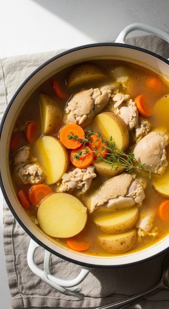 Dice chicken thighs and potatoes into rough chunks. Add to a pot with broth, onion, garlic, and thyme. Bring to a boil, then simmer for 30 minutes. Mash a few of the potatoes against the side of the pot to thicken the broth naturally — no cornstarch needed. This soup is filling, warm, and costs almost nothing per bowl. Russet potatoes and chicken thighs are usually on sale together and store well.