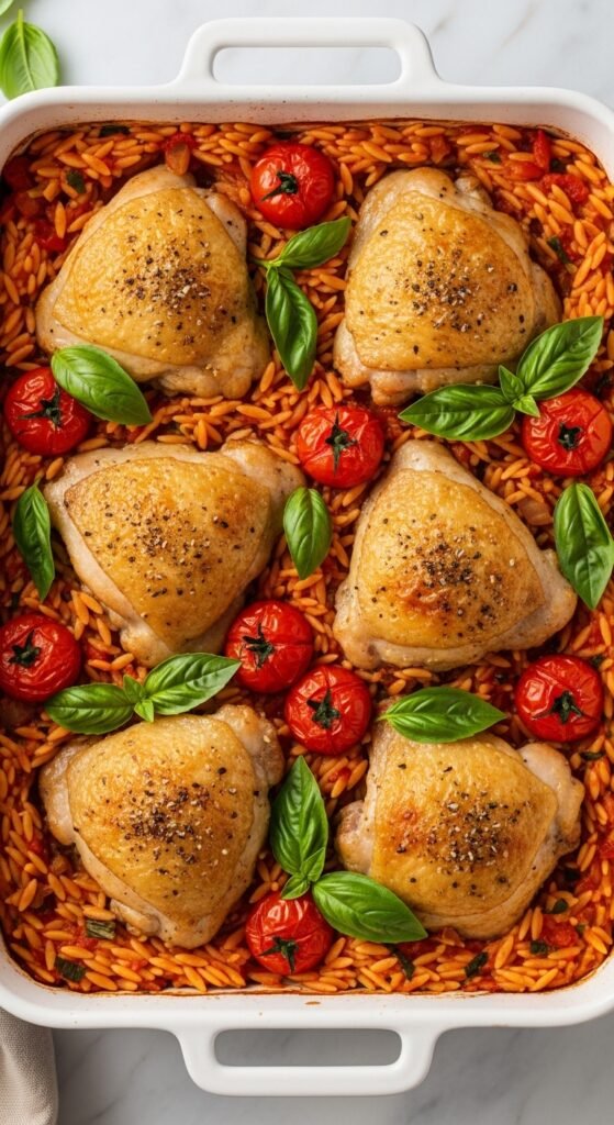 Layer uncooked orzo in a baking dish with canned tomatoes, garlic, olive oil, and broth. Place seasoned chicken thighs on top. Bake at 375°F for 45 minutes. The orzo cooks directly in the sauce and absorbs all the flavor from the chicken drippings. This is technically a one-dish meal, not a one-pot — but cleanup is identical. Orzo costs less than most pasta and cooks faster.