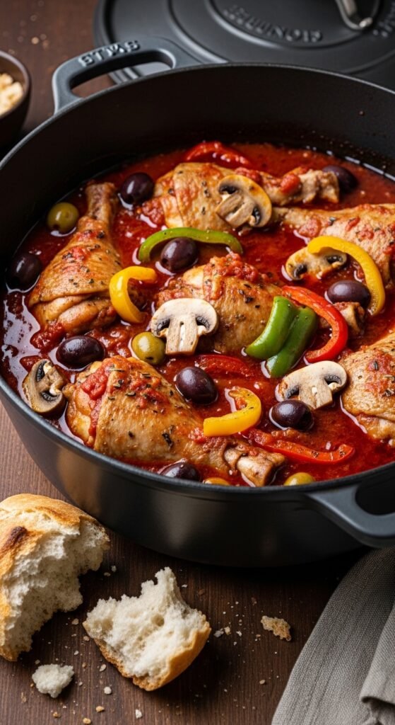 Brown chicken pieces in olive oil, remove them, then cook onions, peppers, and mushrooms in the same pot. Add crushed tomatoes and put the chicken back in. Simmer for 40 minutes on low. Bone-in pieces work best — they stay juicy and add flavor to the sauce. This is an Italian home-cooking classic. Canned tomatoes, one green pepper, and a handful of mushrooms are all you need beyond the chicken.