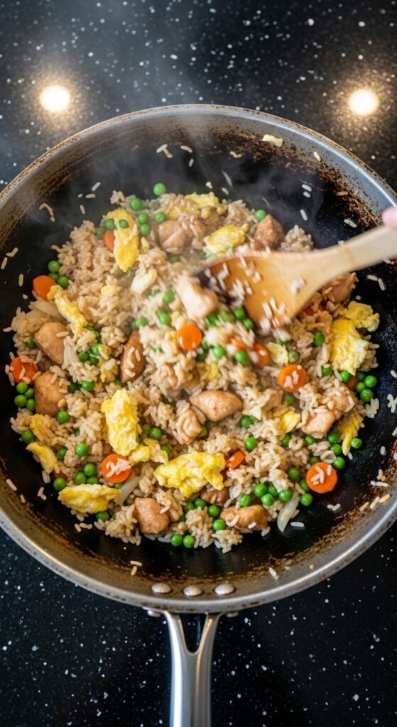 Day-old rice is the secret here. Fresh rice turns mushy. Cook it the night before or in the morning and refrigerate it. When ready, cook diced chicken in a hot oiled wok or skillet, push it to the side, scramble two eggs, then toss in the rice and frozen peas. Add soy sauce and sesame oil. This is a perfect end-of-week meal when you have leftover rice and a few vegetables to use up.