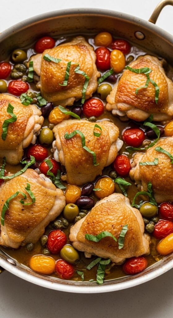 Brown chicken skin-side down, flip, then surround it with cherry tomatoes, green olives, and a few capers. Add a splash of white wine or broth. Cover and braise on low for 35 minutes. The tomatoes burst and create a jammy, briny sauce. Olives do a lot of the seasoning work here, so you barely need any salt. A jar of olives lasts weeks in the fridge — buy it once and use it across multiple meals.