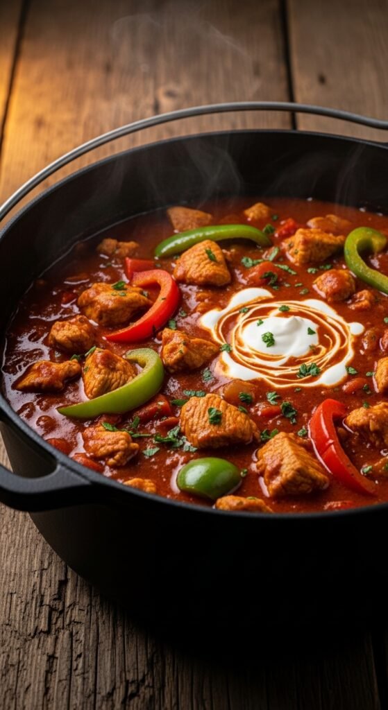 Goulash is built on smoked paprika — buy the biggest tin you can find because you’ll want to make this again. Brown chicken pieces, add onion, garlic, and a generous amount of paprika. Stir in tomato paste and broth. Simmer 30 minutes. Finish with a spoonful of sour cream stirred in at the end. Serve over egg noodles or plain rice. This is deeply comforting food with very simple, inexpensive ingredients.