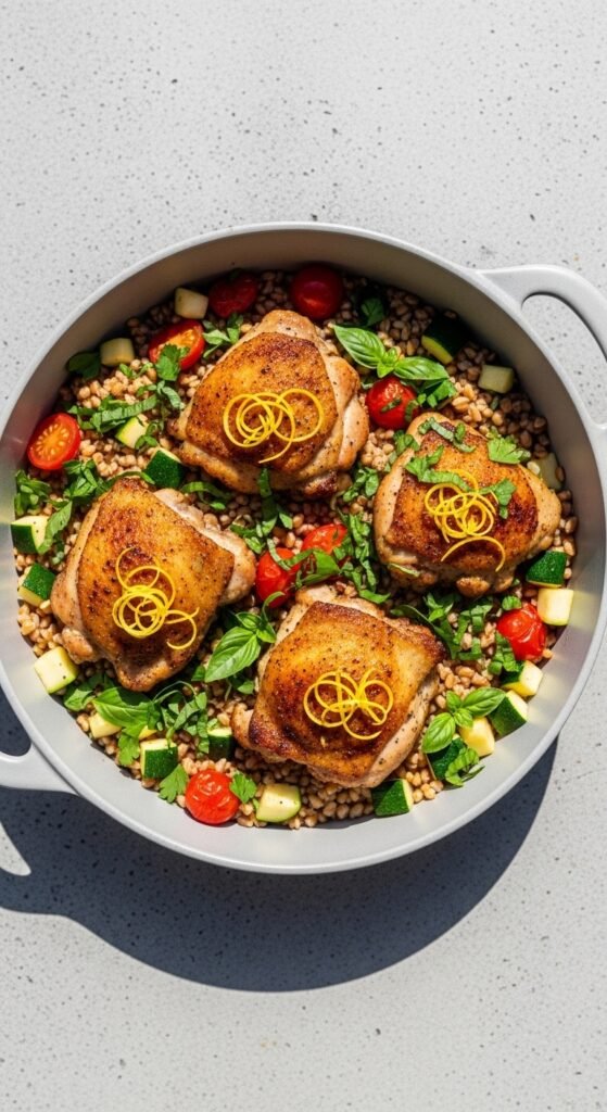 Farro is a hearty whole grain that cooks in one pot with the chicken. Toast the dry farro briefly in a little olive oil before adding broth — it adds a nutty depth. Nestle seared chicken thighs on top of the farro, add lemon zest, thyme, and diced zucchini. Cover and cook until farro absorbs the liquid and chicken is done. Farro is filling and filling means smaller portions, which means lower cost per meal.