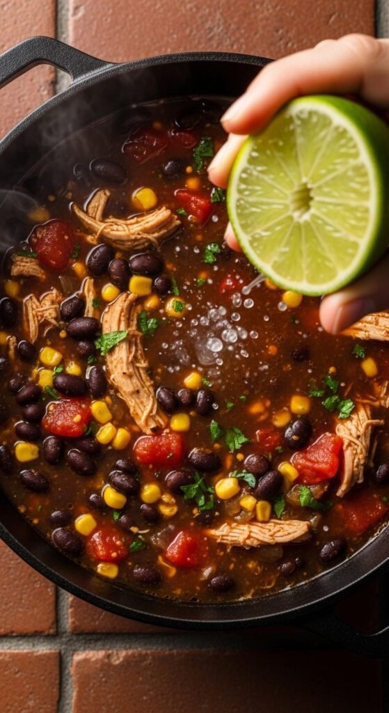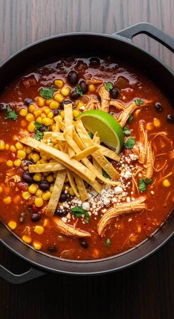 Brown some diced chicken, toss in canned tomatoes, black beans, corn, and chicken broth. Season with cumin, chili powder, and garlic. Simmer for 20 minutes. That’s your soup. Crush tortilla chips on top instead of frying strips — saves time and money. A rotisserie chicken from the deli works even faster. This freezes well, so make a big batch and save half for later.