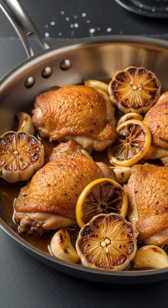 Start by searing the chicken skin-side down in a little oil. Let it get genuinely crispy before flipping. Add whole garlic cloves and lemon slices, pour in a splash of chicken broth, and cover. Cook on low for 20 minutes. The sauce practically makes itself. Garlic gets sweet and soft. Lemon brightens everything. This dish costs almost nothing but tastes restaurant-quality.