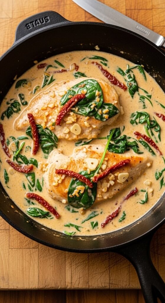 Sear chicken breasts until golden, then make a simple cream sauce right in the same pan. Add sun-dried tomatoes, garlic, and a handful of spinach. Pour in heavy cream or even evaporated milk for a budget swap. Stir and simmer until the sauce thickens. The whole thing takes 25 minutes. Serve with crusty bread to soak up every drop of sauce. Evaporated milk costs half of heavy cream and works just as well here.