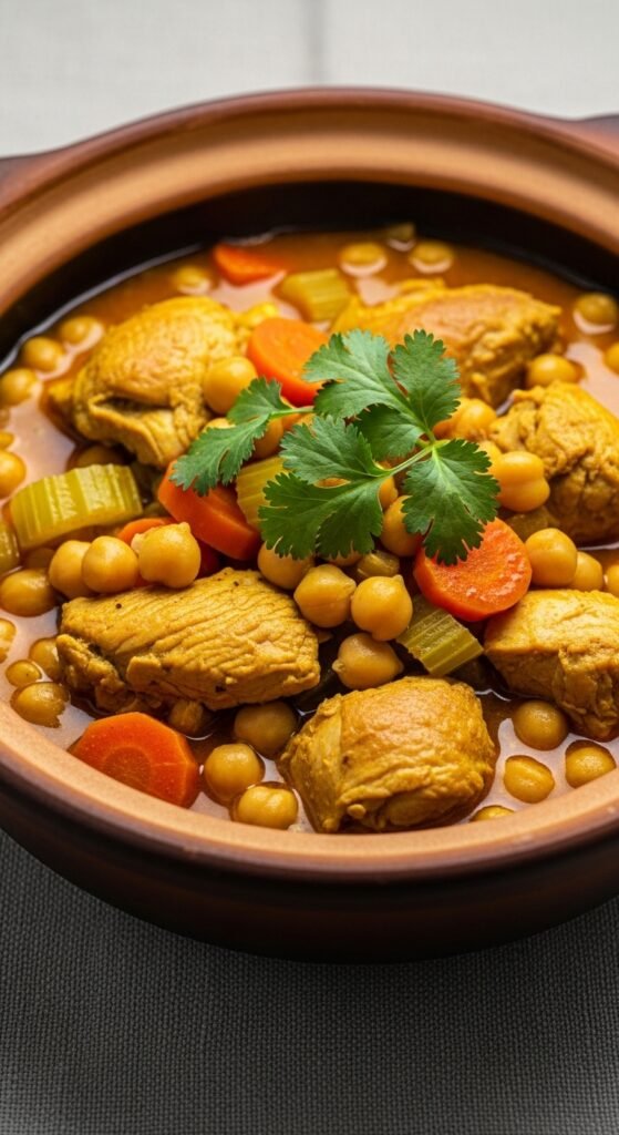 Chickpeas stretch a small amount of chicken into a filling meal for four. Use canned chickpeas — rinse them and they go straight in the pot. Add diced chicken thighs, carrots, onion, tomatoes, cumin, and turmeric. Simmer for 30 minutes. The stew thickens on its own. Chickpeas cost about $1 a can and add protein and fiber. This is one of the most filling, affordable one-pot meals on this list.