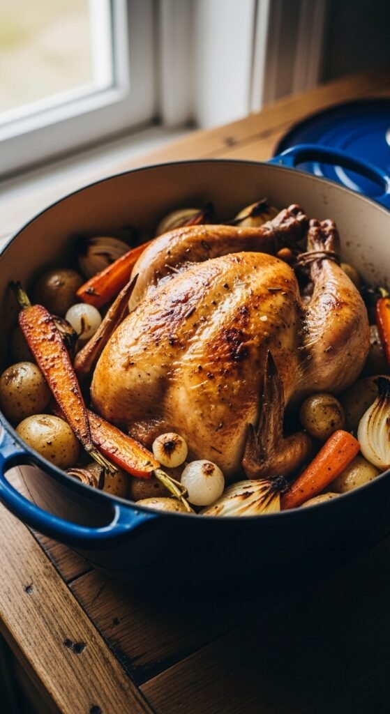 Place a whole chicken in your Dutch oven. Surround it with potatoes, carrots, and onions. Season everything generously with salt, pepper, and olive oil. Cover and roast at 375°F for 90 minutes. The pot traps steam, keeping the chicken juicy while the vegetables caramelize below. Whole chickens are usually cheaper per pound than cut pieces. One bird feeds four people easily — and leftovers become tomorrow’s soup.