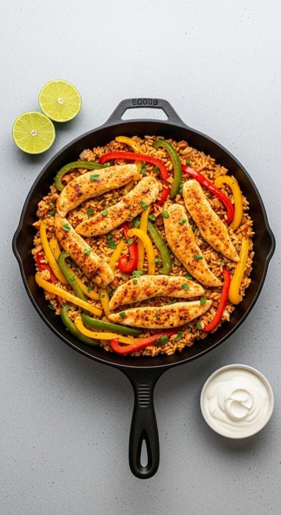 Slice chicken breasts thin and cook them in a hot skillet with oil. Add bell peppers and onions, then stir in uncooked rice, chicken broth, and fajita seasoning. Cover and cook until the rice absorbs the liquid. One packet of fajita seasoning costs under $1 and does all the flavor work. Skip the tortillas if you’re on a budget — the rice bowl is satisfying on its own. Top with whatever you have: salsa, cheese, sour cream.