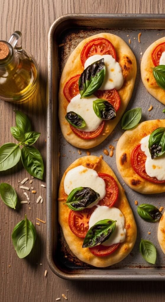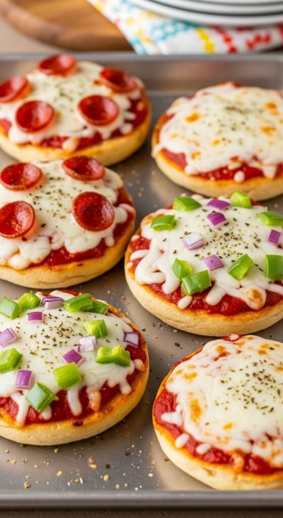 Split English muffins. Toast them lightly first so they don’t get soggy. Add sauce and cheese. Bake 8 minutes at 400°F.
