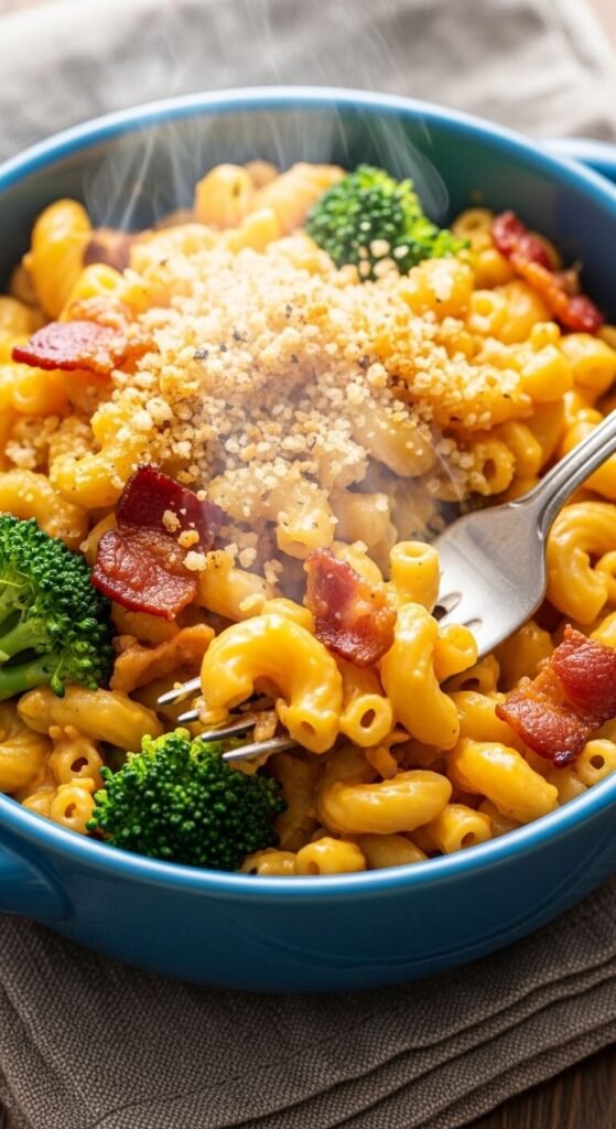 Mix the broccoli into the mac and cheese. Add protein by stirring in diced ham or rotisserie chicken.