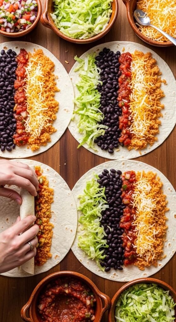 Warm tortillas in the microwave for 20 seconds. Set out fillings: rice, beans, cheese, lettuce, salsa, sour cream.