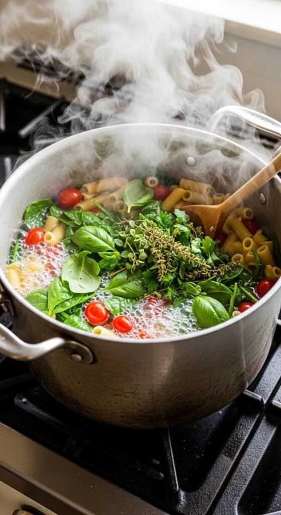 The pasta absorbs the sauce as it cooks. Everything becomes one dish. Add frozen meatballs if you want protein.