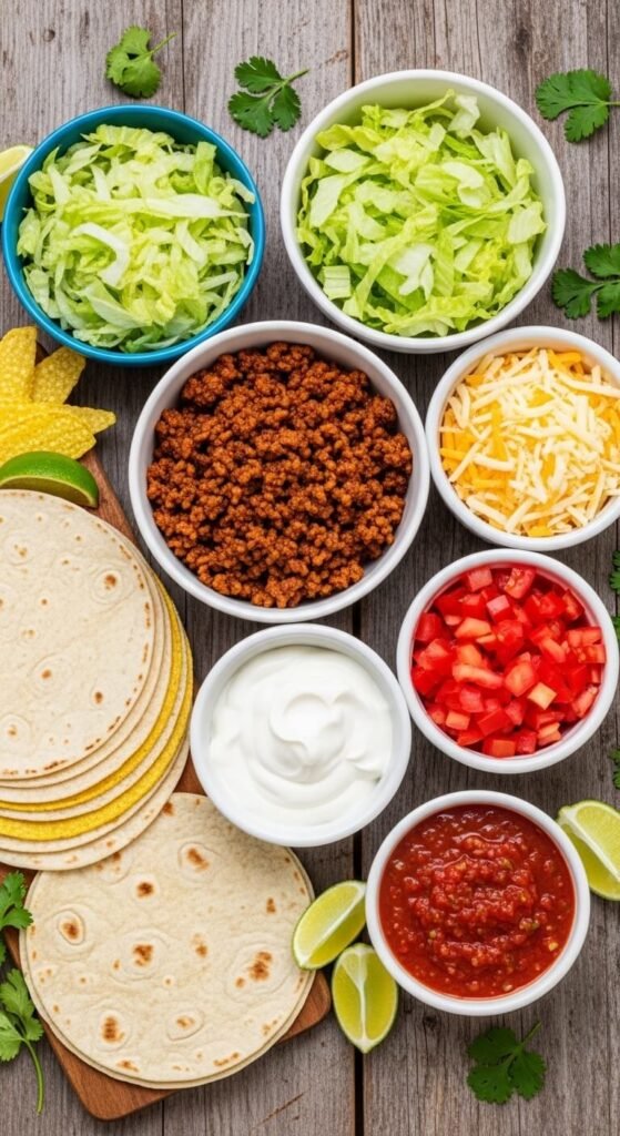 Brown ground beef with taco seasoning. Set out bowls with cheese, lettuce, tomatoes, and sour cream.