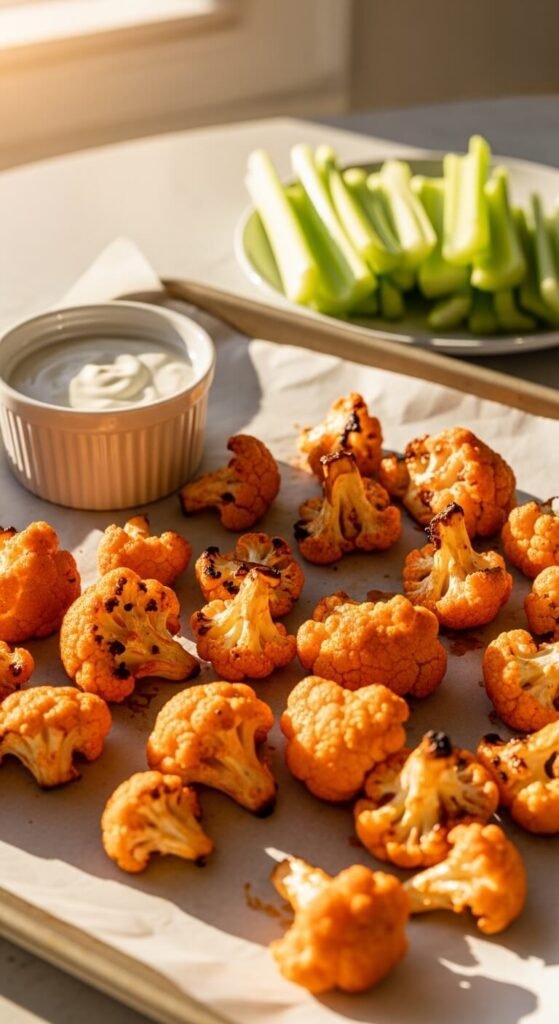 Bake at 425°F for 25 minutes. The cauliflower gets tender with crispy edges. The buffalo flavor concentrates and tastes amazing.
