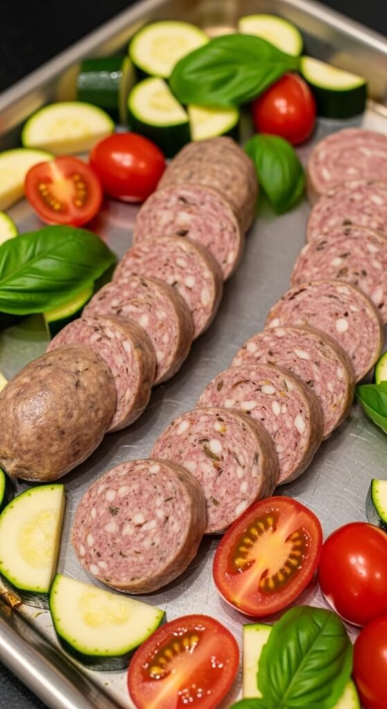 Use mild or hot Italian sausage based on your preference. Slice into thick rounds. No need to precook. Add sliced zucchini and halved cherry tomatoes.