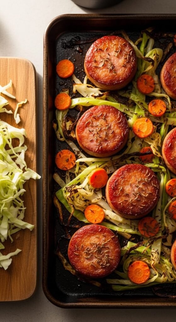 Slice kielbasa into thick coins. Shred half a head of cabbage. Slice carrots into rounds. Toss everything together with olive oil and caraway seeds if you have them.