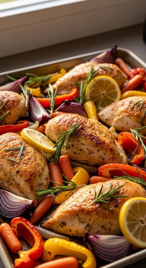 Cut chicken breasts into even pieces so they cook at the same rate. Toss vegetables in olive oil and dried herbs from your spice rack. Arrange everything in a single layer to get those crispy edges everyone loves.