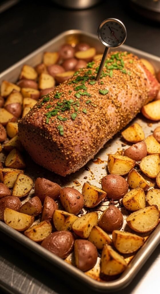 Arrange potatoes around the pork. Bake at 425°F for 25 minutes. Use a meat thermometer to check. Pork should reach 145°F.