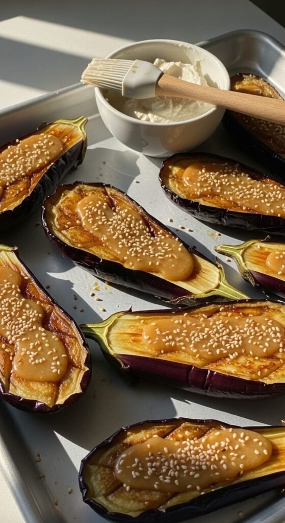 Place cut-side up on the pan. Bake at 400°F for 25 minutes. The eggplant gets tender and caramelized. The miso creates a savory glaze.