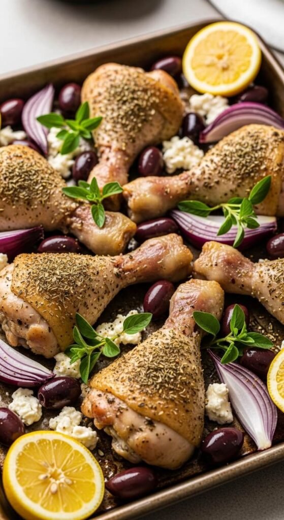 Use bone-in chicken pieces for the best flavor. Season with dried oregano, garlic powder, salt, and pepper. Add kalamata olives and sliced red onions around the chicken.