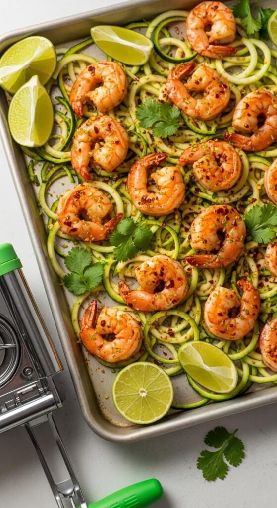 Buy pre-spiralized zucchini noodles to save time. Toss shrimp with chili flakes, lime zest, and olive oil. Add the zucchini noodles.