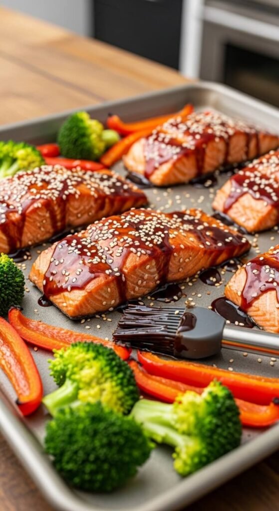 Add broccoli florets and sliced bell peppers around the salmon. They soak up the teriyaki drippings and taste amazing. Bake at 400°F for 15 minutes.