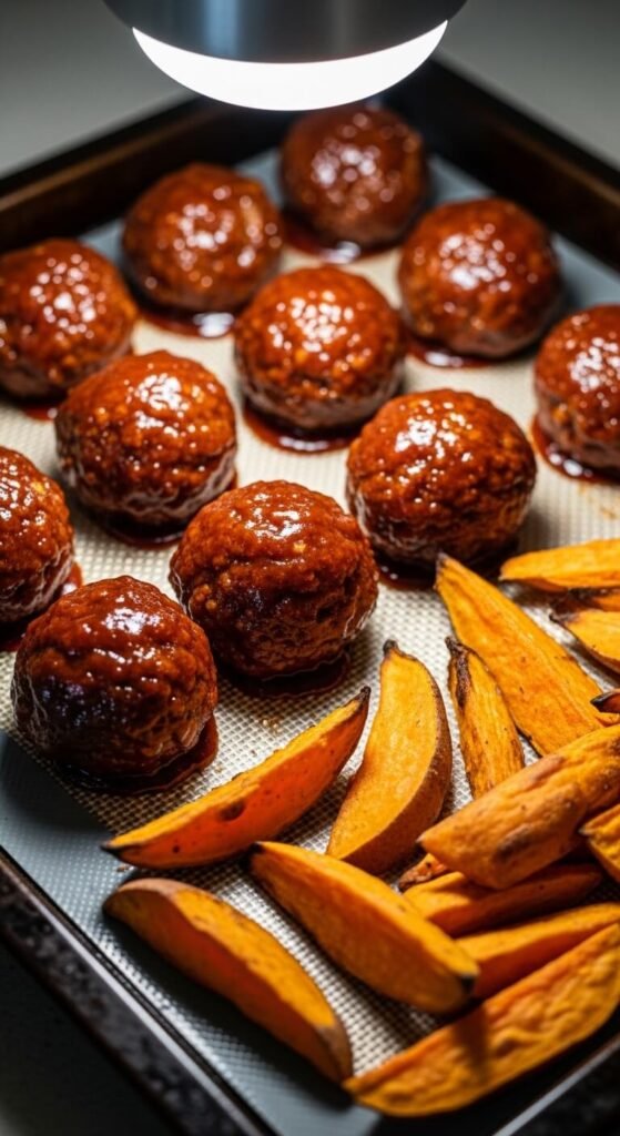 BBQ Meatballs with Sweet Potato Wedges