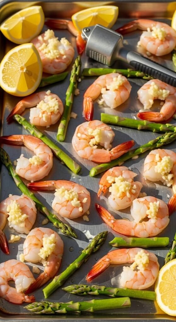 Snap off the woody ends of asparagus and arrange around the shrimp. Season everything with salt, pepper, and a squeeze of lemon juice. Bake at 400°F for 10 minutes.