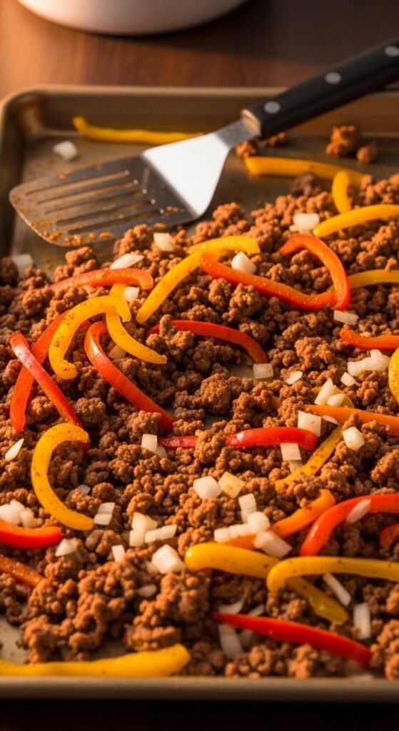 Brown ground beef in a skillet first. This takes 10 minutes. Mix in a packet of taco seasoning with a splash of water. Spread on your sheet pan.