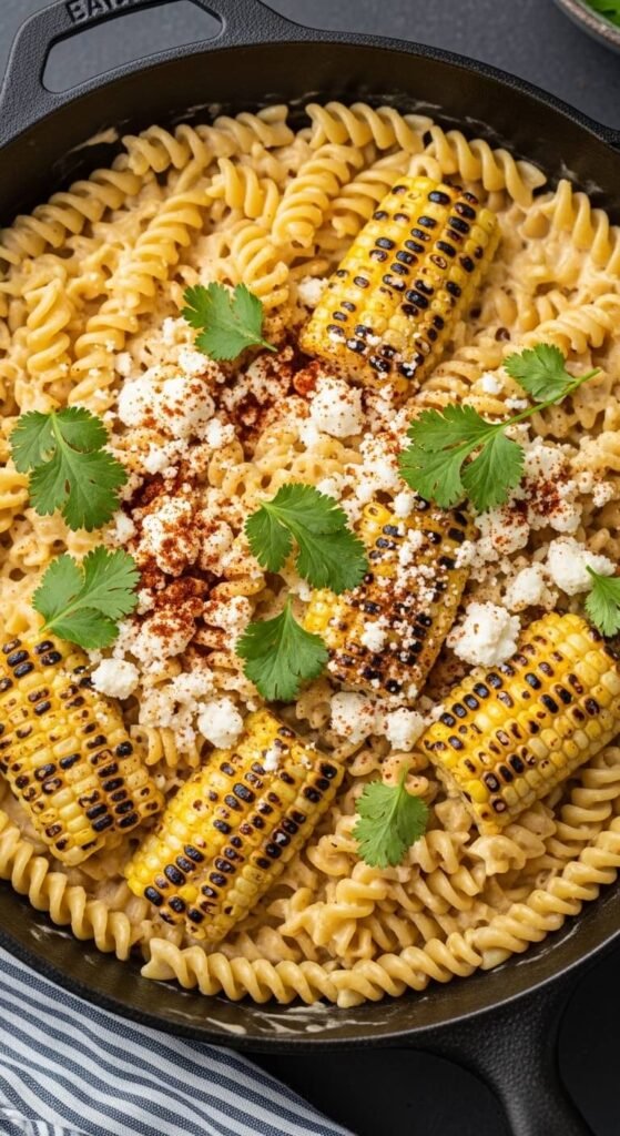 Cook pasta and drain. Toss with frozen corn, mayo, lime juice, and chili powder. Add cotija cheese or parmesan.