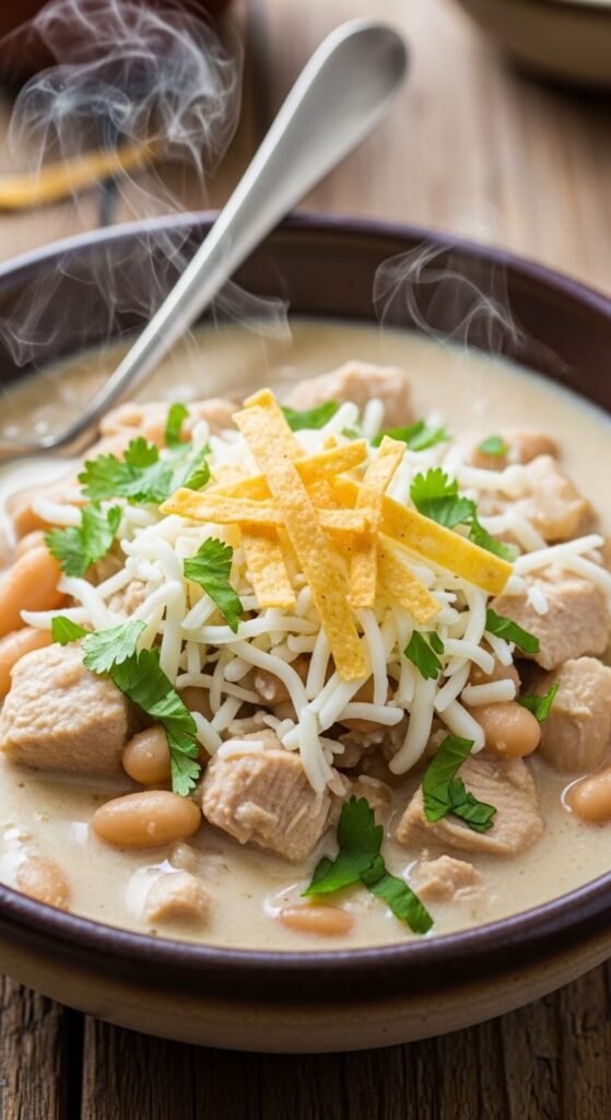 Top with cheese, cilantro, and crushed tortilla chips. Serve with cornbread or warm tortillas. The cream cheese makes it rich and creamy.