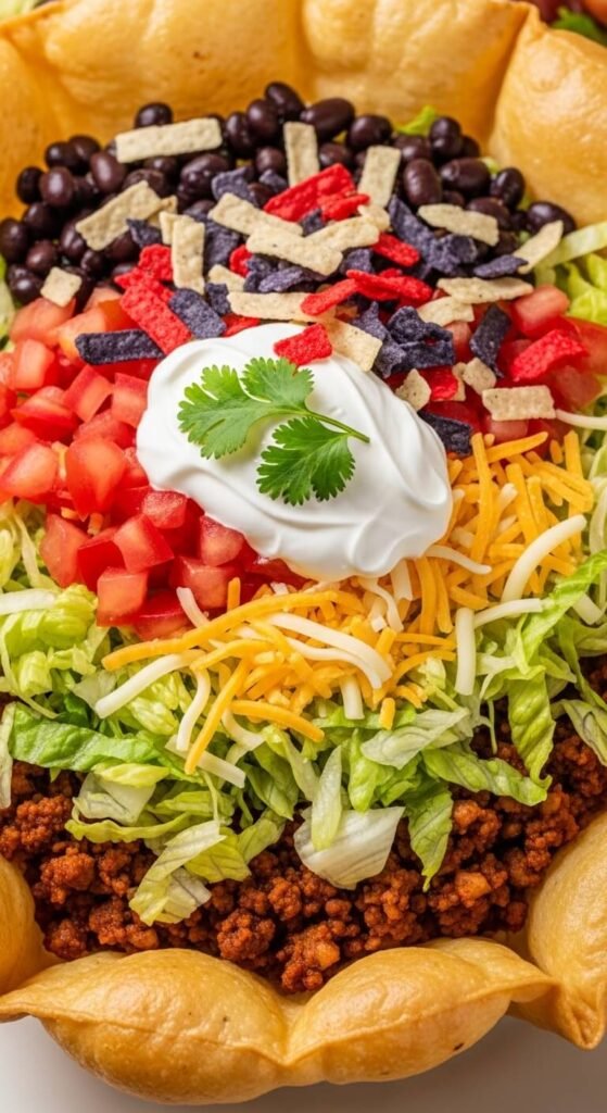 Brown ground beef with taco seasoning. Let it cool slightly. Chop lettuce, tomatoes, and cheese. Mix everything in a large bowl with crushed tortilla chips.