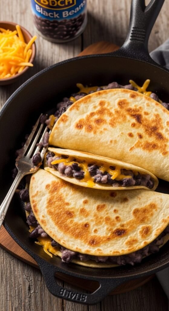 Use flour tortillas as the crust. Spread refried beans on top, then add seasoned ground beef and cheese. Bake at 450°F for 10 minutes.