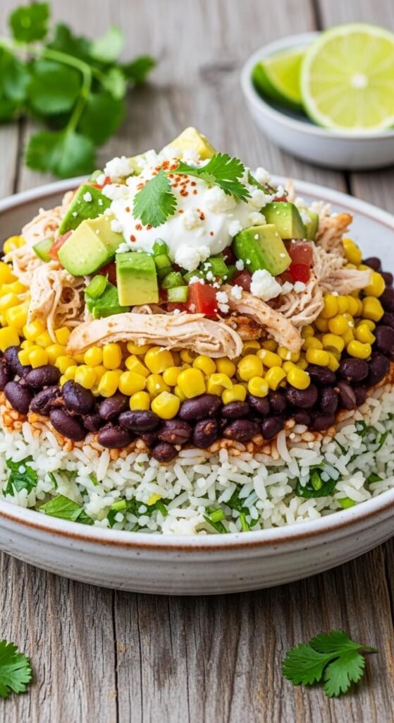 Cook white rice and mix in lime juice and cilantro. Layer with canned black beans, frozen corn, and shredded rotisserie chicken. Add whatever toppings you have on hand.