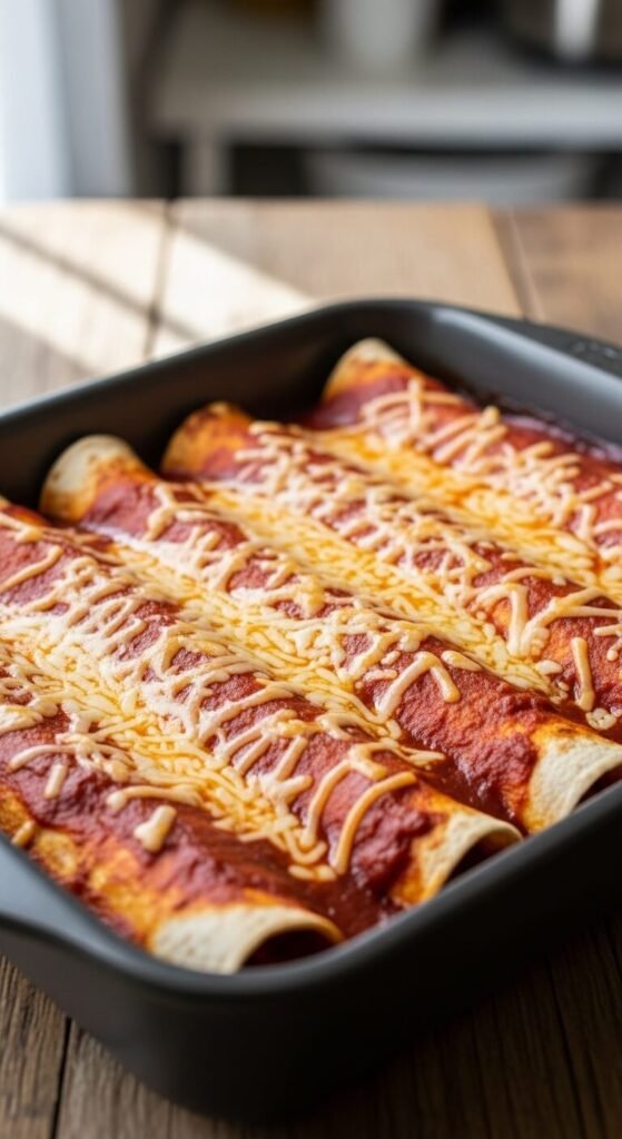 The sauce comes from a can—no shame in that. Add diced onions to the filling if you want. Serve with Spanish rice from a box.