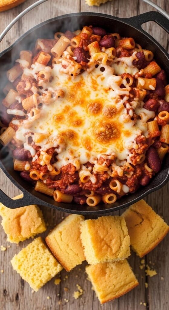 Brown ground beef with onions. Add canned tomatoes, beans, chili powder, and cooked elbow macaroni. Top with shredded cheese. This mashup combines two comfort foods into one pot. Canned beans and tomatoes keep costs under $8 for six servings. Kids love the cheesy pasta. Adults love the hearty chili flavor. Make a double batch and freeze half.