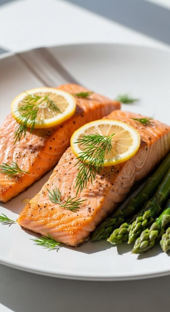 Season salmon fillets with salt, pepper, and dried herbs. Heat butter in a pan over medium-high heat. Cook salmon skin-side down for 4 minutes without moving. Flip and cook 2-3 minutes more. Squeeze lemon juice over the top. Serve with steamed vegetables or rice. Frozen salmon works fine and costs less than fresh. Use whatever herbs you have—dill, parsley, or thyme all work. The skin gets crispy if you don’t move the fish while cooking. Leftover salmon makes great salads or pasta dishes.
