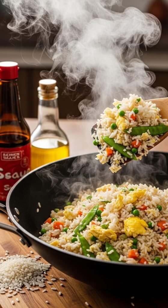 Heat oil in a large pan or wok. Add day-old rice and break up clumps. Push rice to the side and scramble eggs in the empty space. Mix eggs into rice. Add frozen mixed vegetables, soy sauce, and sesame oil. Stir-fry for 3-4 minutes until hot. Use leftover takeout rice or cook rice in the morning and refrigerate it. Fresh rice gets mushy. Add diced ham, shrimp, or rotisserie chicken for protein. This costs pennies per serving and uses up leftovers. Top with green onions or hot sauce.