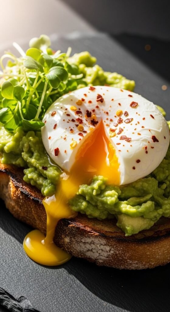 Toast thick bread slices until golden. Mash ripe avocado with lime juice, salt, and pepper. Spread on toast. Top with a fried or poached egg. Sprinkle with everything bagel seasoning or red pepper flakes. Add sliced tomatoes or radishes if you have them. Use whatever bread you have on hand. Skip fancy avocado oil and use regular olive oil. The egg makes this a complete meal with protein. Buy avocados when they’re on sale and ripen them at home.