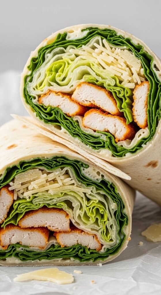 Chop rotisserie chicken into bite-sized pieces. Toss romaine lettuce with Caesar dressing. Add chicken, parmesan cheese, and croutons. Wrap everything in large tortillas. Use store-bought rotisserie chicken to skip cooking entirely. Make your own dressing by mixing mayo, lemon juice, garlic, and parmesan—it’s cheaper. Regular lettuce works fine. Add bacon bits for extra flavor. These wrap up nicely for packed lunches. Warm the tortillas for 10 seconds so they fold without cracking.