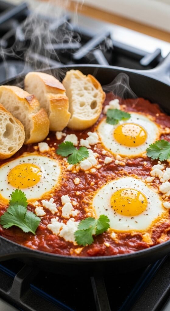 Simmer canned crushed tomatoes with onions, garlic, cumin, and paprika for 10 minutes. Make small wells in the sauce. Crack eggs into the wells. Cover and cook for 5-7 minutes until whites set but yolks stay runny. Sprinkle with feta and cilantro. Serve with bread for dipping. This uses pantry staples and costs almost nothing. Add bell peppers or spinach to the sauce. Use any spices you have. Perfect for breakfast-for-dinner. One pan means easy cleanup.