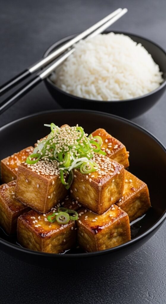 Press tofu to remove water, then cube. Mix miso paste, honey, soy sauce, and rice vinegar for glaze. Pan-fry tofu cubes until golden on all sides. Pour glaze over tofu in the last minute. Toss to coat. Serve over rice with steamed vegetables. Extra-firm tofu works best and stays cheap. Press it between plates with a weight on top for 10 minutes. The glaze works on chicken too. This protein-packed meal costs pennies. Add sriracha for spice.