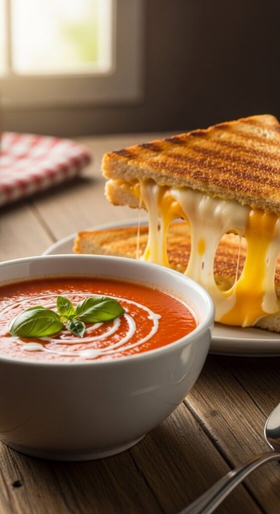 Heat canned crushed tomatoes with garlic, onion powder, and a splash of cream or milk. Simmer for 10 minutes. Blend with an immersion blender if you have one. Season with salt, pepper, and dried basil. Make grilled cheese in a hot pan with butter. Use any cheese you have. Add a pinch of sugar to the soup to cut acidity. This combo feels fancy but costs almost nothing. Make extra soup for tomorrow’s lunch. Dip the sandwich directly in the soup.