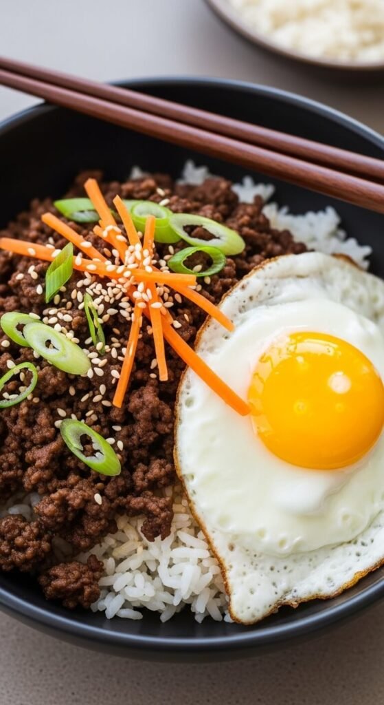 Brown ground beef in a large pan. Mix soy sauce, brown sugar, ginger, and garlic. Pour over cooked beef and simmer for 2 minutes. Serve over rice with a fried egg on top. Add green onions and sesame seeds. Make the sauce while the beef cooks. Use ground turkey to save money. Add frozen stir-fry vegetables to stretch it further. This tastes like takeout but costs a fraction. The sweet-savory sauce is addictive. Kids devour these bowls.