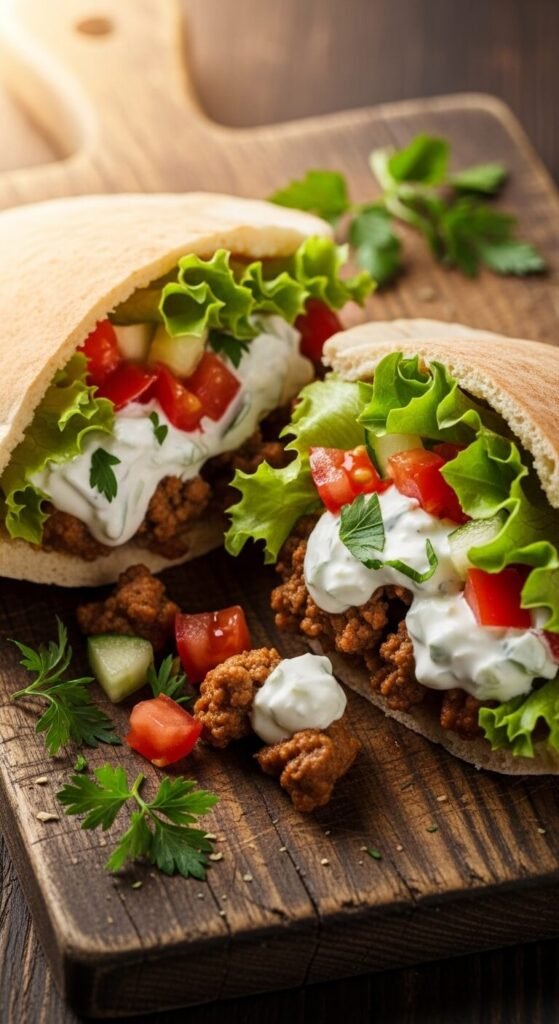 Brown ground beef or turkey with oregano, garlic powder, and cinnamon. While meat cooks, dice tomatoes, cucumber, and onion. Mix yogurt with lemon juice and dill for sauce. Warm pitas in the oven for 1 minute. Fill with meat and vegetables. Drizzle with yogurt sauce. Add crumbled feta if you have it. Use ground turkey instead of lamb to save money. Make the yogurt sauce ahead and keep it in the fridge all week. These pack great for lunch too.