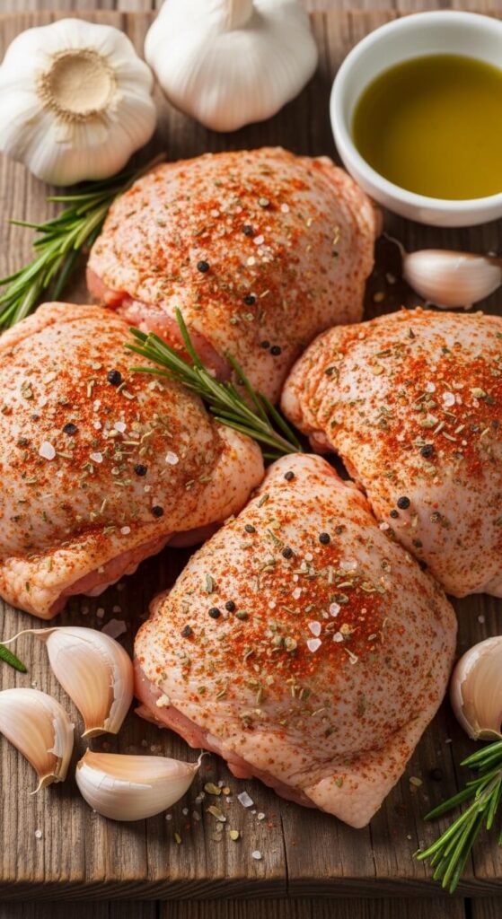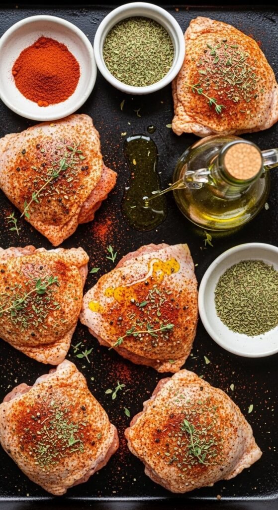 Pat your chicken thighs completely dry with a paper towel before applying the rub. This is the most underrated step — moisture is the enemy of a crispy, golden skin. Once dry, coat every surface generously with oil and then your seasoning mix.